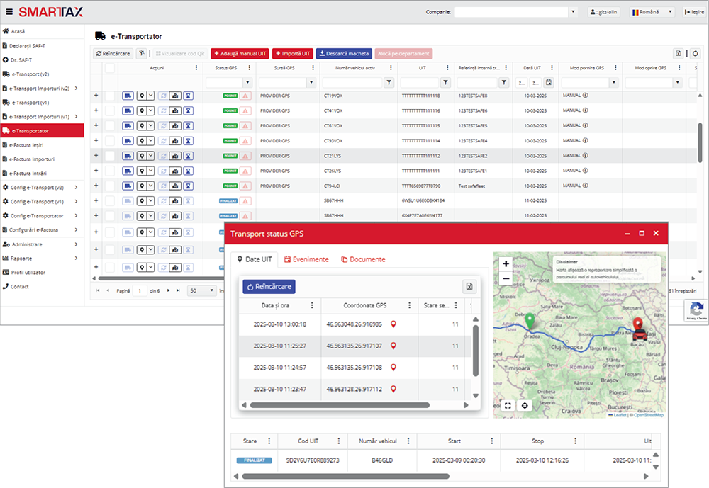 Parte a platformei SmartTAX de raportare ANAF, e-Transportator este un serviciu care permite raportarea automată a coordonatelor GPS în sistemul RO e-Transport și gestionarea codurilor UIT.